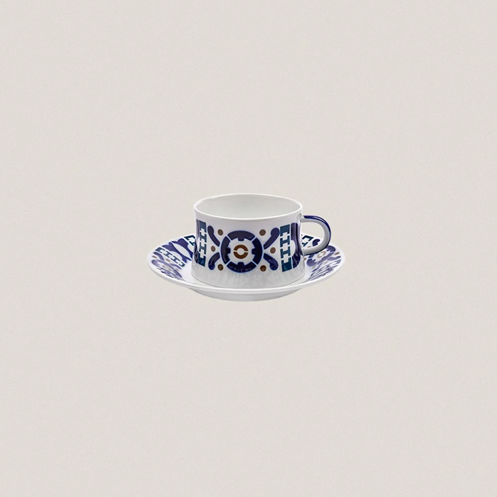 Juego de desayuno de 2 servicios decorado Burela. Se inspira en los motivos tallados en madera, del balcón de una vieja casa de Burela (Lugo).