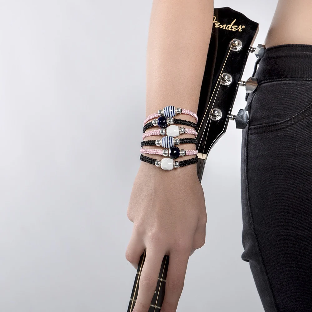 Pulsera ajustable de macramé rematada en plata con pieza central de porcelana.